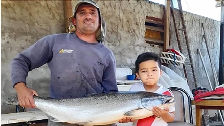 Emiliano Almada                                                                                  Emiliano Almada and his son holding the salmon he found in the Paraná River, Fighiera, Argentina, November 15, 2022