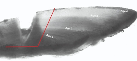 A detail from Esteban Avigliano’s analysis of the otolith in Almada’s salmon, showing chemical traces left at different stages of the fish’s life