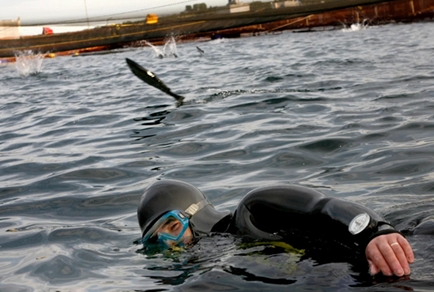 A diver from the city of Quellón swimming in a salmon pen at a farm run by the company Salmones Pacific Star off the coast of Chiloé Island, Chile, 2006